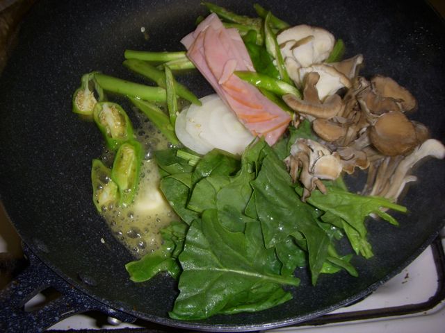 2、フライパンに多めにバターを入れて、解け切る前に具材を入れて炒める。