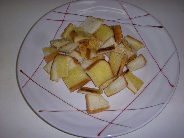 4、パンを焼いてマーガリンをぬり、一口大に切って器に盛り付ける。