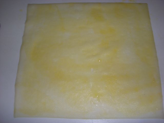 次に春巻きの皮に溶き卵を塗り、数枚重ねていく。