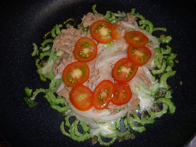 6、ゴーヤの上にツナ玉ねぎと、スライスしたトマトをのせ加熱する。