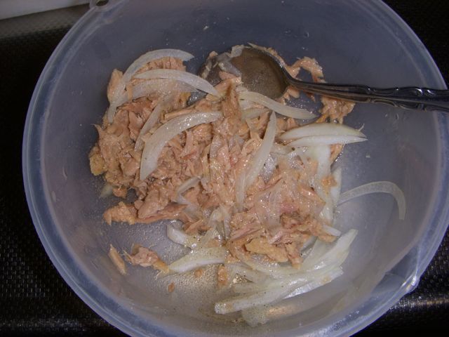 5、ツナ缶と玉ねぎを和え、軽く塩コショウで下味をつける。(準備の段階で作っておきます)