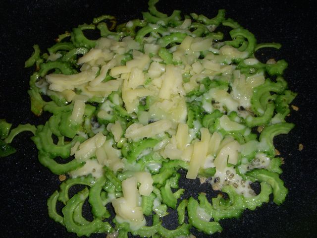 4、弱火にしてゴーヤを円形に集め、とろけるチーズをかける。