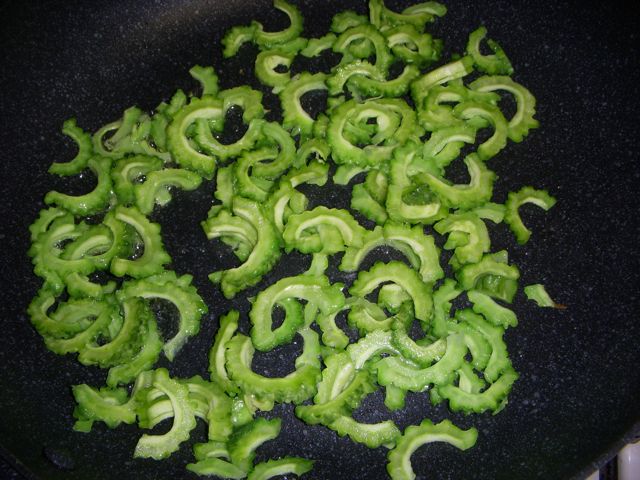 1、ゴーヤをわって種を外し、薄切りにしておく。