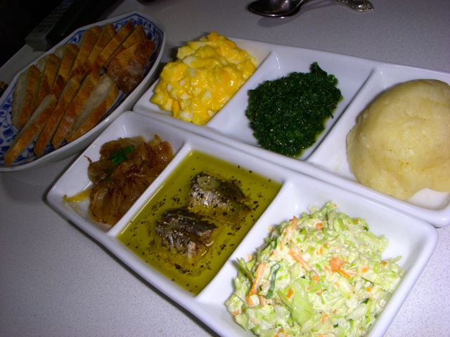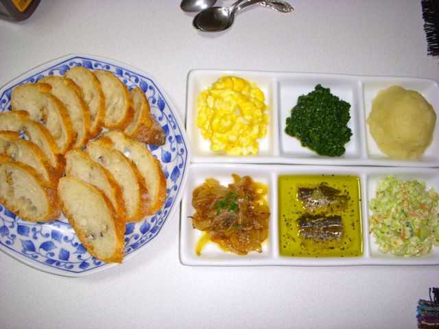 玉子マヨネーズ、コンソメほうれん草、マッシュポテト、オニオン炒め、オイルサーディン、コールスロー。