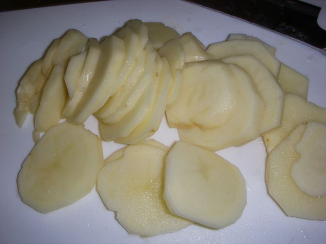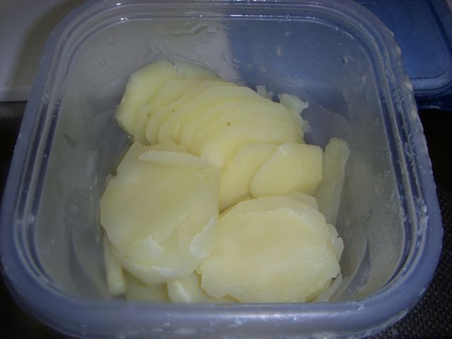 薄切りにしたジャガイモを、ジップロックコンテナ入れ、ひたひたまで水を入れて、レンジで加熱。