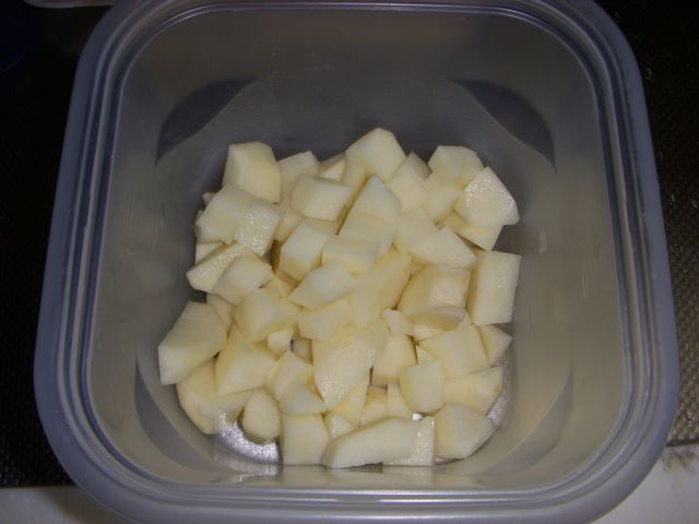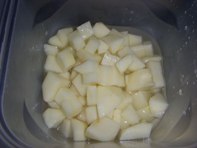 それで、手抜き時短でやるので、最初からさいの目切りにして水を入れてレンジをかける。