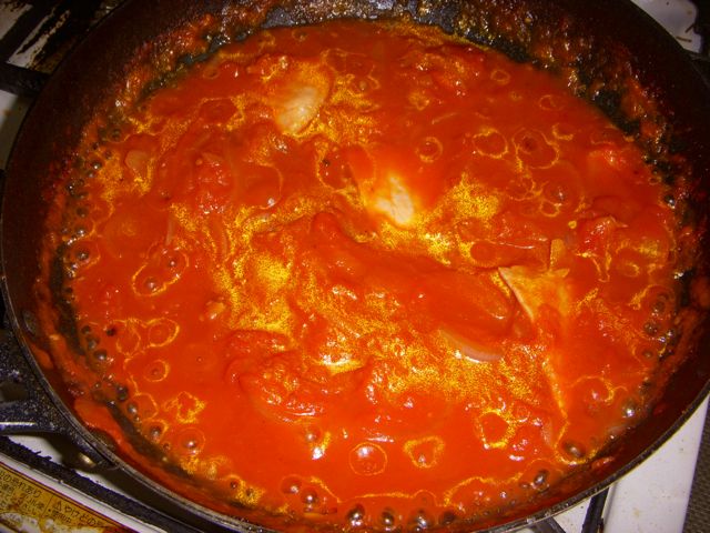 5、ベーコンをオリーブオイルで炒め、そこへホールトマトとをつぶして投入。