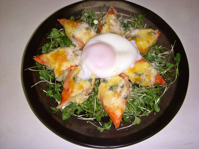 かにかまはチーズをかけてトースターで焼き、新芽の上に乗せる。