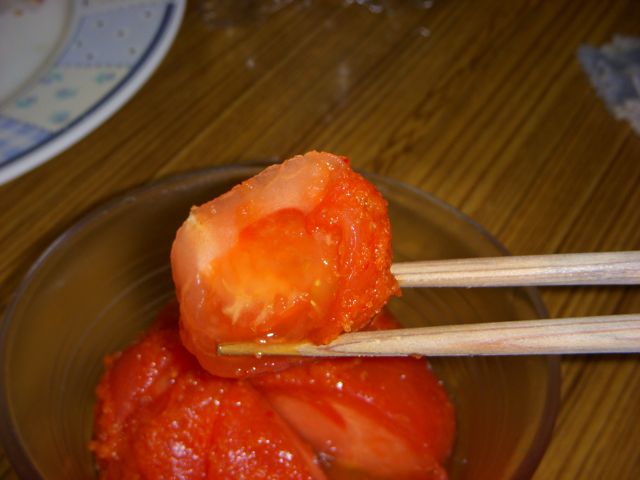 近くに惣菜&野菜屋が出来たんだけど、前を通ったらなにか赤いものが売ってて、普通のトマトと思いきや、キムチに使ったトマトだった。